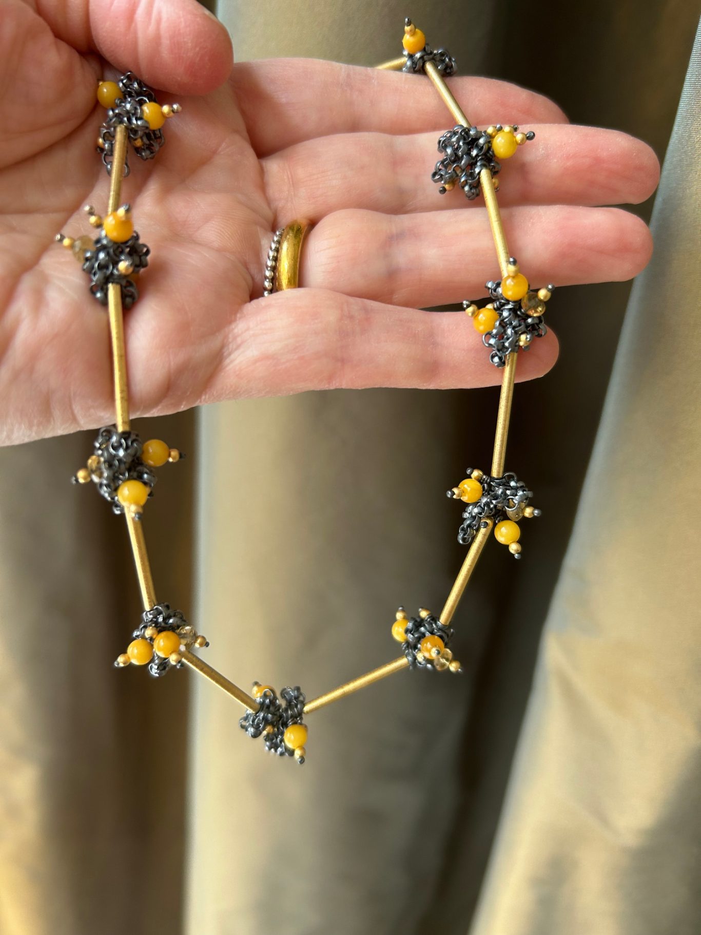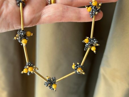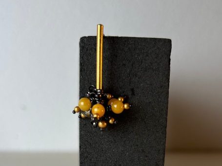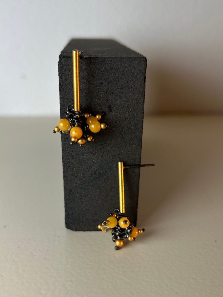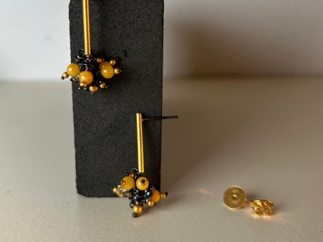 Zauberhafte Ohrstecker aus geschwärztem Silber, Feingold, Bernstein und Citrin, eine ganz wundervolle Kombination.