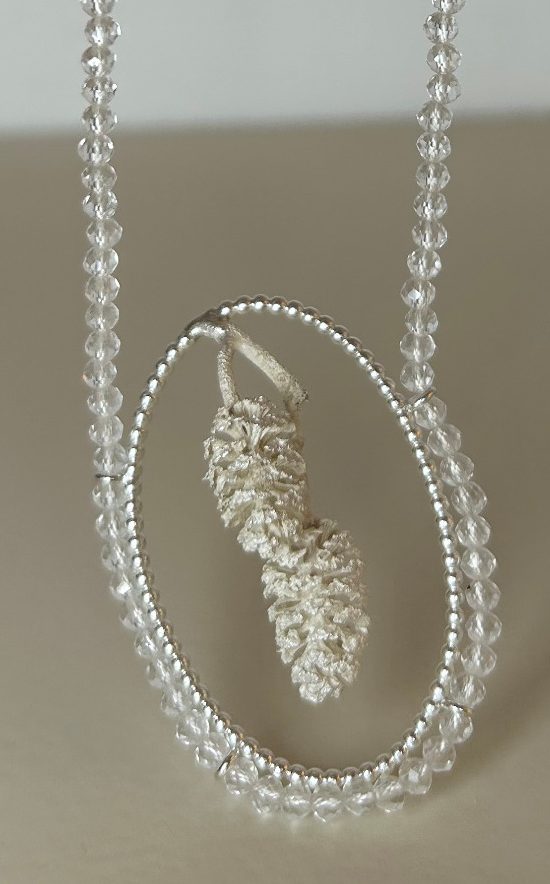 Zauberhaftes Amulett mit silbernen Erlen in einem Rahmen aus 925/000 Silber mit geschliffenen Bergkristallkugeln.