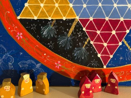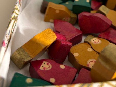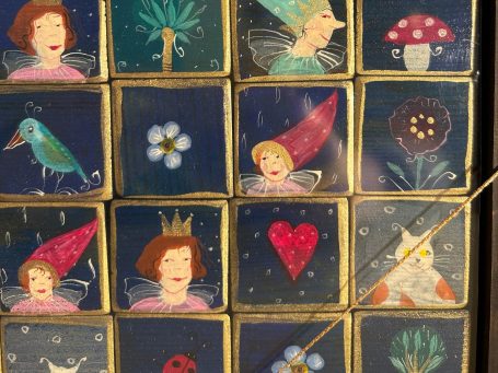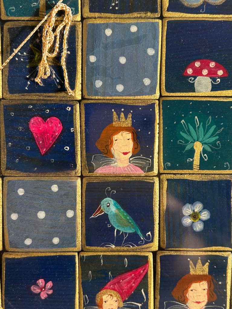 Alles wurde aus Holz gefertigt, liebevoll bemalt und versiegelt. Das Spielbrett entführt uns in eine kleine eigene Welt, ein bezauberndes Geschenk.