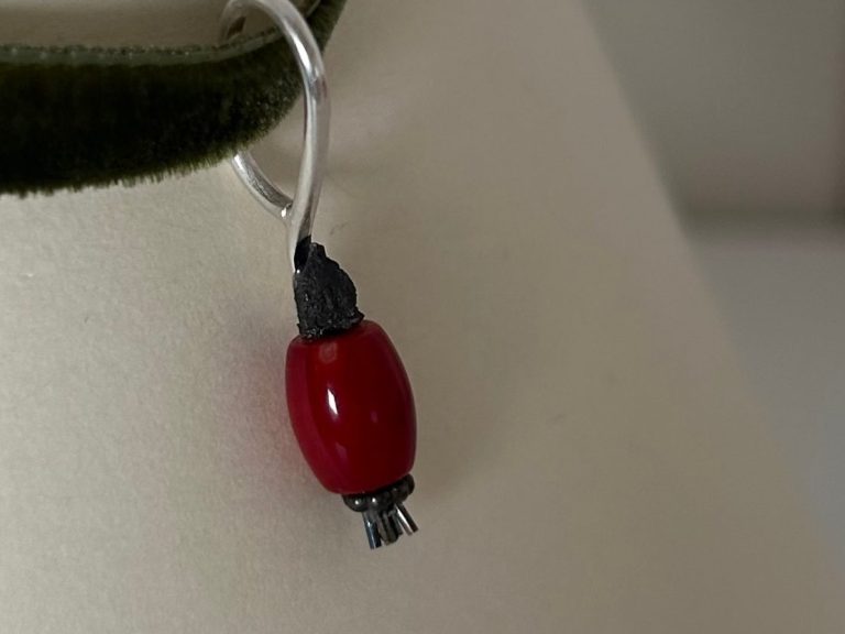 Perlen, rote Korallenkugeln und geschmiedete Schleifen, welche auch gleichzeitg als Verschluss für die 3-reihige Variante dient.